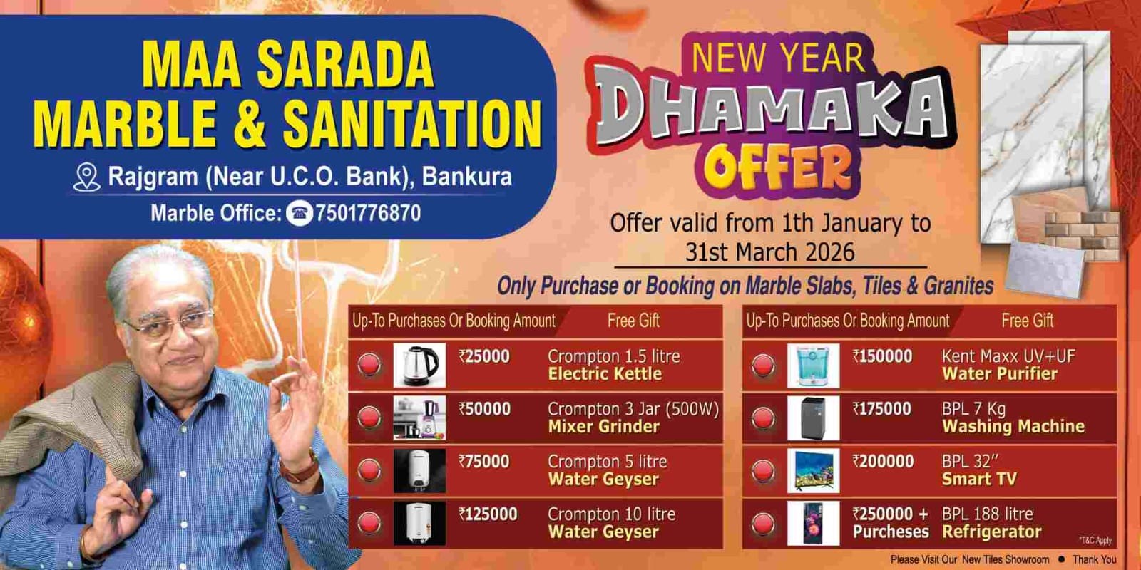 Ma Sarda Marble & Sanitation is a trusted destination in Bankura for marble, granite, tiles and sanitary products. The showroom offers a wide range of branded floor and bathroom tiles, modular kitchen items, bathtubs, slabs and more under one roof.
